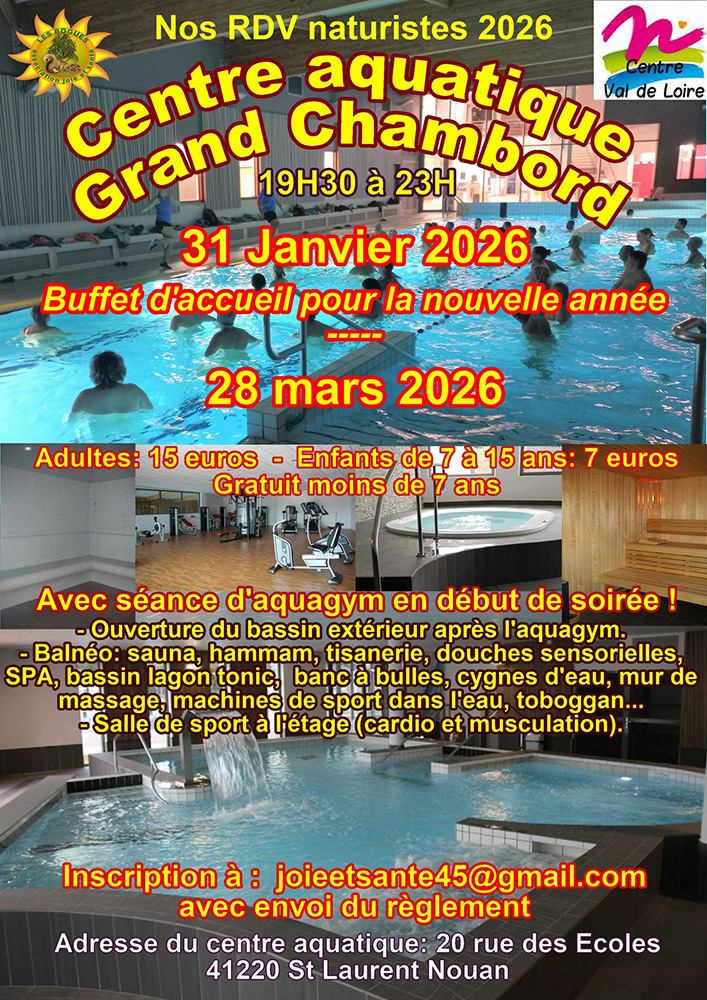 Se connecterBienvenue ! Connectez-vous à votre compte :votre nom d'utilisateurvotre mot de passe Mot de passe oublié? obtenir de l'aidePolitique de confidentialitéRécupération de mot de passeRécupérer votre mot de passevotre email Un mot de passe vous sera envoyé par email.Découvrez les disponibilités dans les centres de la Fédération des Espaces Naturistes AccueilActualitésSur l'agendaBien-etre naturiste au Grand ChambordBien-etre naturiste au Grand ChambordSur l'agendaBy Jean-Luc Bouland30 janvier 20268PartagerFacebookTwitterPinterestWhatsApp POUR NE RIEN MANQUER, ABONNEZ-VOUSA NOTRE NEWSLETTER HEBDOMADAIRE Tagsaquagymbien-etreGrand ChambordhammamJoie et SanténatationnaturismepiscinesaunaPartagerFacebookTwitterPinterestWhatsApp LAISSER UN COMMENTAIRE Annuler la réponseConnecter pour laisser un commentaireArticle précédentDe Belles cinquantenaires mises à nu Dans le même style Sur l'agendaLe président de la FFN en visioconférence 23 janvier 2026 Sur l'agendaNaturisme N°93 est toujours disponible ! 17 octobre 2025 Nos partenairesNous vous invitons à visiter les sites de nos partenaires ci-dessous, en 1 clic