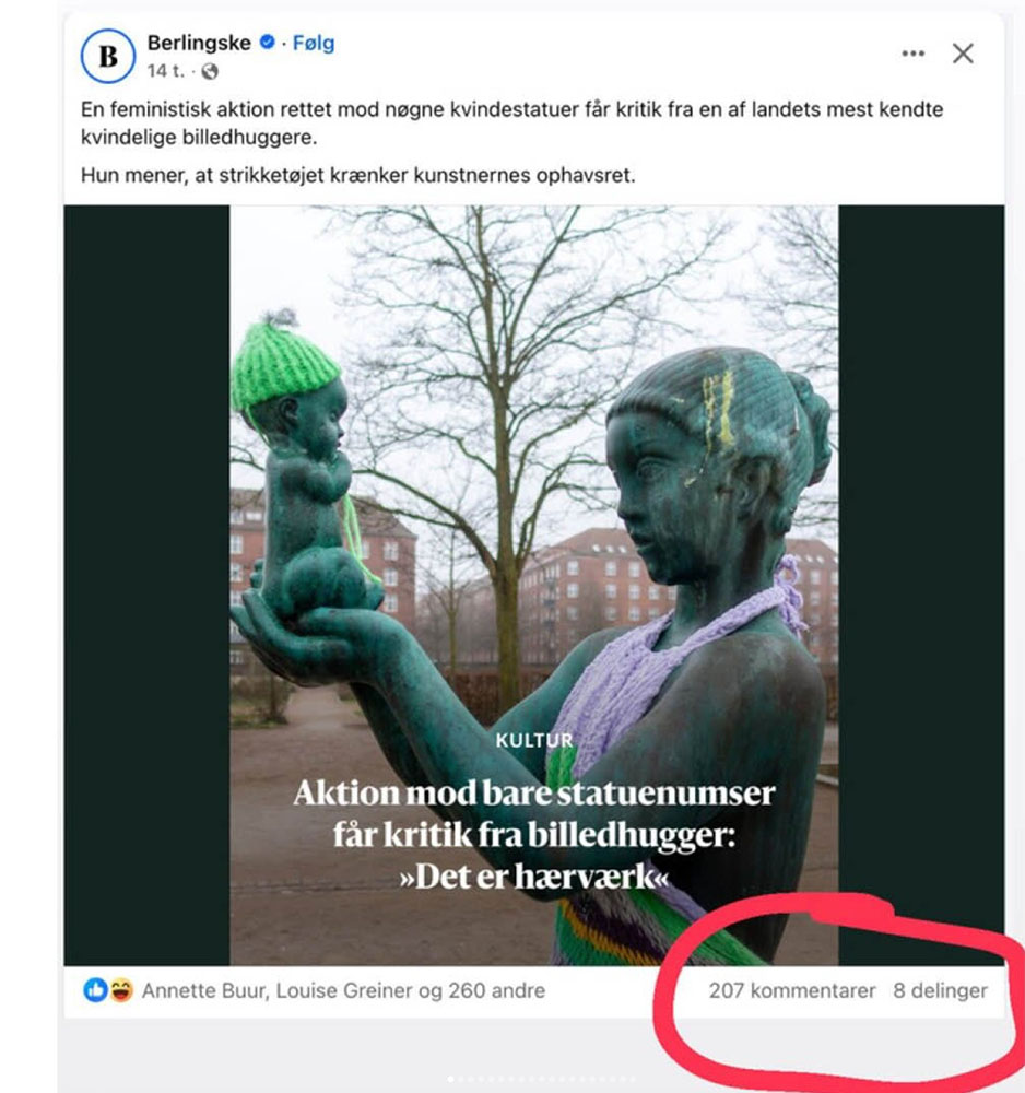 C’est le site J’ai piscine avec Simone qui l’a révélé en France fin mars. Au Danemark, depuis plusieurs semaines, des vêtements et accessoires tricotés sont venus recouvrir des statues de femmes nues. « L’initiative est née avec Louise Mørup, consultante RH, face à une statue de Vénus nue portant son enfant dans un jardin public de Copenhague», indique le site. Elle s’interroge alors sur la manière dont les femmes sont représentées. « Pourquoi sont-elles si souvent montrées comme des corps à regarder, et si rarement comme des figures historiques à célébrer ? » Une invisibilisation qu’elle a choisi de combattre à coups d’aiguilles et de laine…et qui a fait des émules. relayé sur instagram par l’écrivaine Maren Uthaug, cette initiative invitant d’autres femmes à l’imiter a fonctionné, et c’est dans tout le pays, d’une ville à l’autre, que « d’autres participantes se sont mises à tricoter robes, écharpes ou accessoires pour habiller à leur tour des figures féminines de bronze ou de pierre. Ce qui n’était au départ qu’une intervention ponctuelle s’est ainsi transformé en mobilisation collective, portée par un ton à la fois ludique, ironique et résolument féministe.»