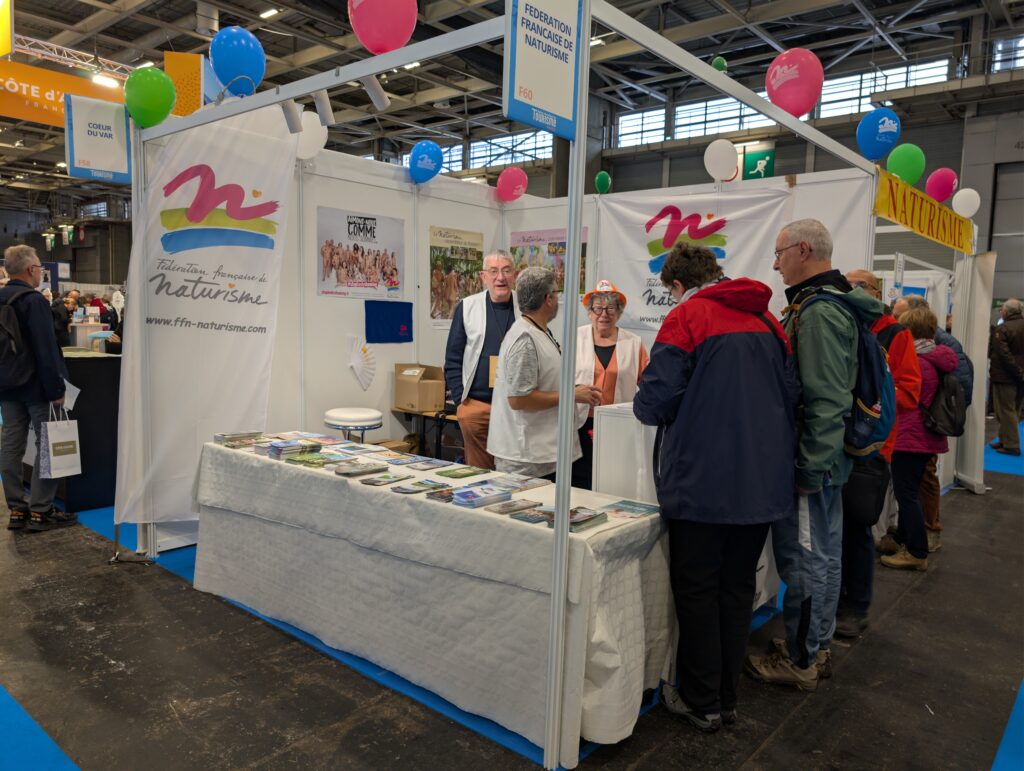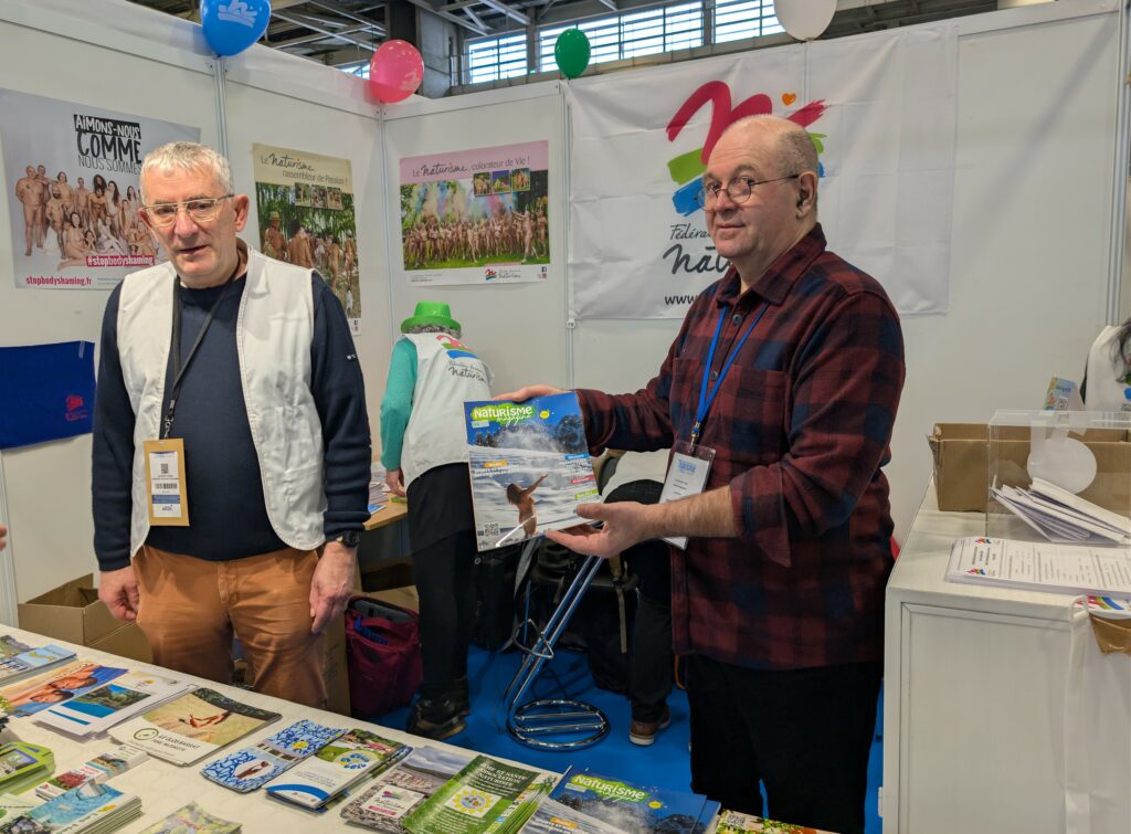 Sur le stand, les volontaires peuvent participer à une tombola pour gagner un séjour, repartir avec des cadeaux estampillés FFN (stylos, éventails, serviettes), récupérer quelques bonbons, certes, mais surtout obtenir des informations sur les associations adhérentes et espaces naturistes partenaires, discuter du prix de la licences, de destinations plus ou moins lointaines, ou, tout simplement, bavarder entre adeptes du même art de vivre. Ce que firent avec entrain quelques uns avec le président de la FFN, Albert Richard, et d’autres avec le responsable de la rédaction de Naturisme Magazine, présent ces jeudi et vendredi. Et personne ne s’est étonné que tout le monde soit habillé…