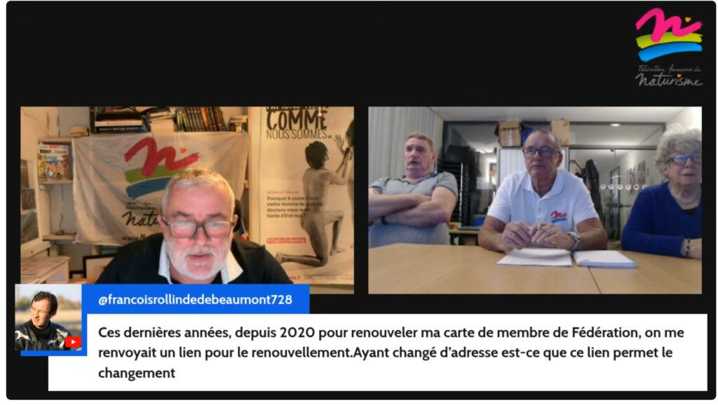 Combien coûte la licence fédérale ? Comment l’obtenir ? Quels sont les rendez-vous festifs et sportifs de l’année ? Quels services sont proposés aux adhérents ? Vendredi 30 janvier 2026, Albert Richard, président de la fédération française de naturisme, entouré des membres du bureau fédéral, répondait sur ces sujets, et sur bien d’autres, aux internautes, qu’ils soient simples adhérents ou responsables d’associations.
