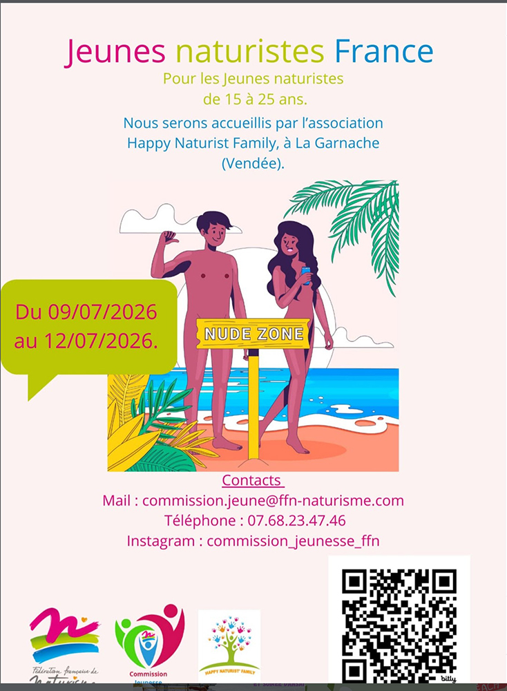« Voici le premier séjour dédié aux jeunes naturistes de France organisé par la commission jeunesse de la fédération française de naturisme ! Nous serons accueillis par l’association Happy Naturist’ Family, en Vendée (85), du 9 au 12 juillet 2026», expliquent les organisateurs. Ce séjour aura pour but de faire se rencontrer d’autres jeunes naturistes, venant de partout dans l’hexagone, « en proposant des animations dans lesquelles ils pourront jouer en équipe, se détendre, faire connaissance les uns avec les autres, dans l’optique de pouvoir rassembler une nouvelle génération de naturistes !»
