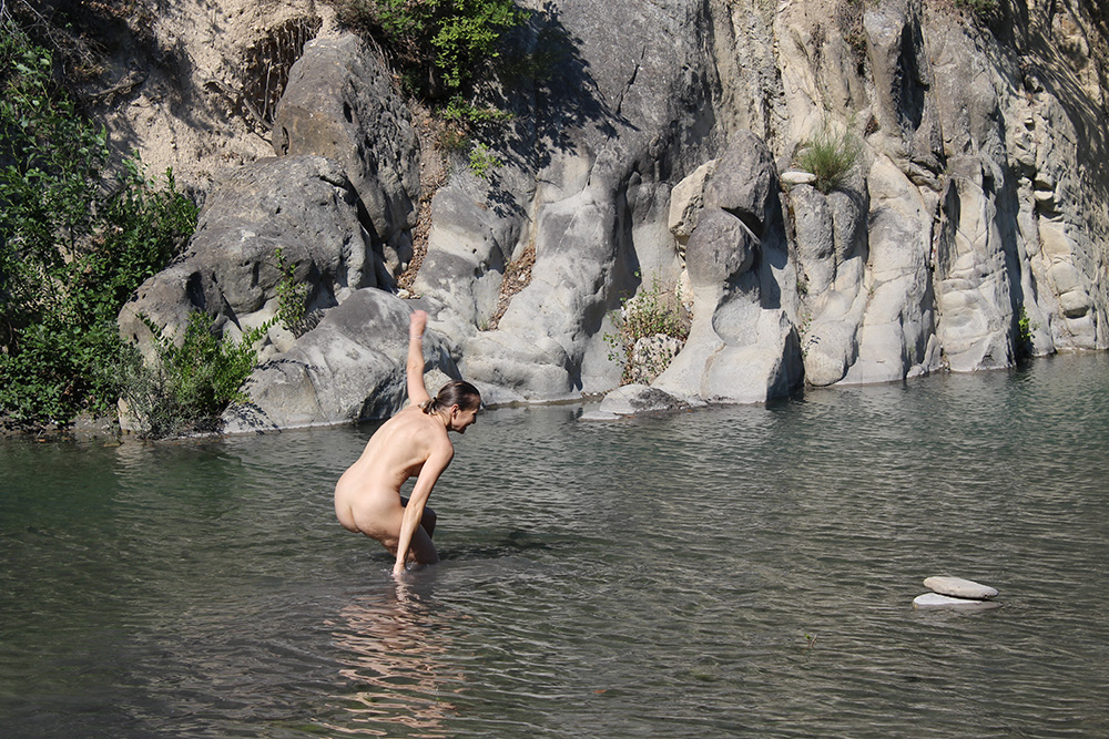 Je pars de Nice. un peu plus tard, me revoici devant cet immense portail, et la magie opère à nouveau ! Je rejoins Rach dans notre chalet, avant de prendre le chemin “sportif” jusqu’à la rivière. Nus, basquets aux pieds, appareil photo en bandoulière. Nous sommes seuls… Avec la sècheresse, la rivière n’est pas bien haute mais il y a tout même un trou d’eau sympathique où nagent quelques poissons.